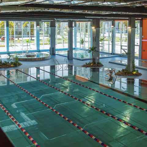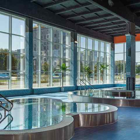 В состав зоны входят 25-метровый бассейн с декоративными водопадами, детский бассейн и бассейн, предназначенный для обучения плаванию. Термальный комплекс включает русскую, финскую и соляную бани, ледяную купель и джакузи. Для отдыха предусмотрена зона с шезлонгами, а также кафе, интегрированное в структуру водно-термального пространства.
