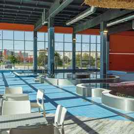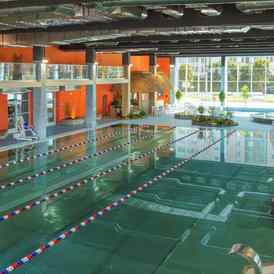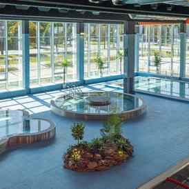 В состав зоны входят 25-метровый бассейн с декоративными водопадами, детский бассейн и бассейн, предназначенный для обучения плаванию. Термальный комплекс включает русскую, финскую и соляную бани, ледяную купель и джакузи. Для отдыха предусмотрена зона с шезлонгами, а также кафе, интегрированное в структуру водно-термального пространства.